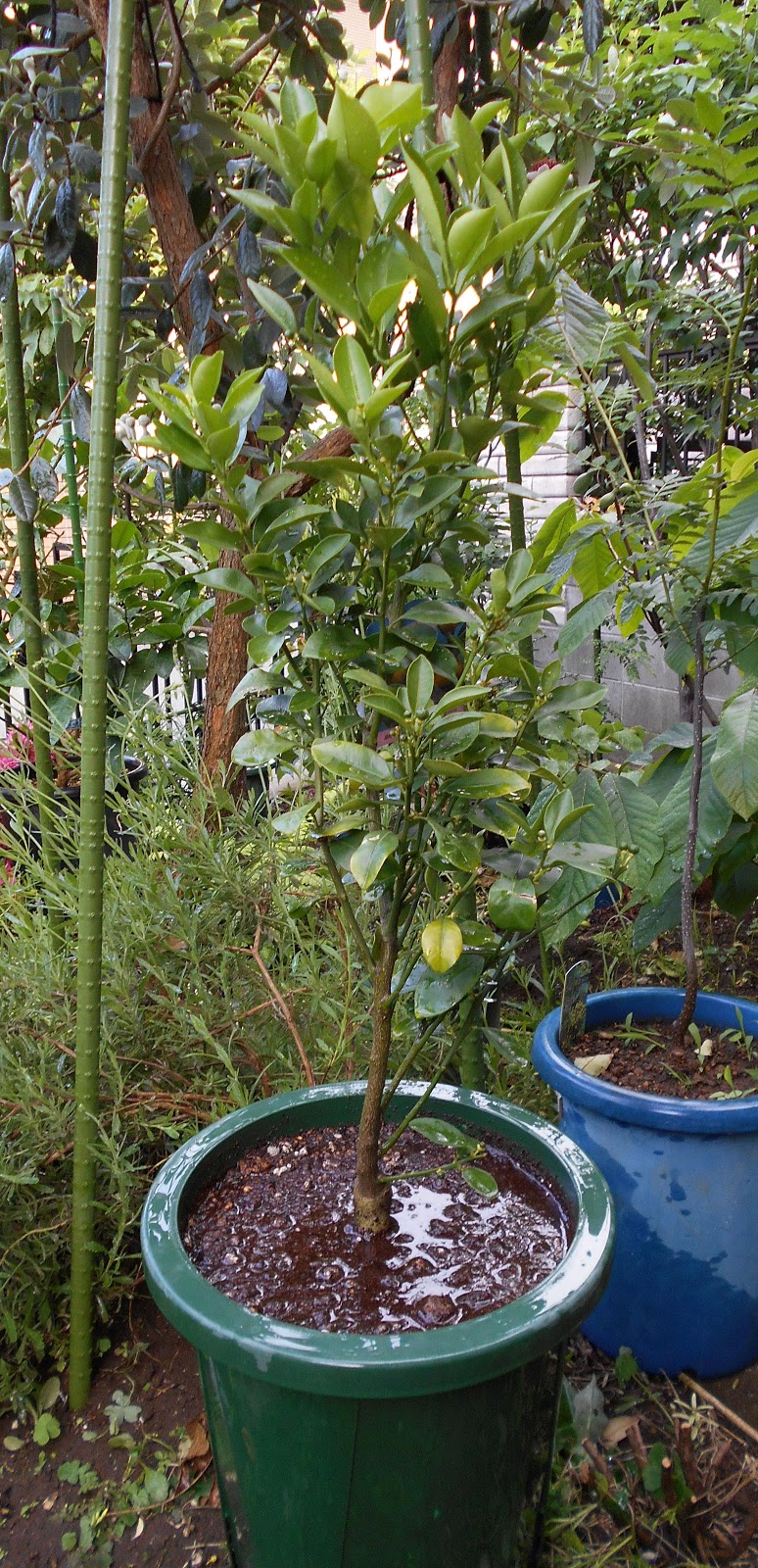 梅雨に向けて柑橘類の風通しを良くしようと剪定していたら、ベルガモットに幼果が1個だけ着いているのを発見しました。4月に蕾がないか探したときは見つからなかったので、今年も初開花はダメかと諦めていましたが、1個だけ咲いて自家受粉していたようです。ベランダで風通しの悪い場所に鉢を置いてあるので、葉の裏にダニが着き始めているようです。