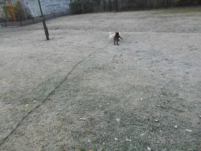 今までは思いっきり走れる草地ばかりを利用してきましたが、タイガはこういう林で臭いとりをすると夢中になるので、行動範囲を広げることにしました。ヒート中なので、あちこちで「名刺」をバラ撒きながらの移動です。