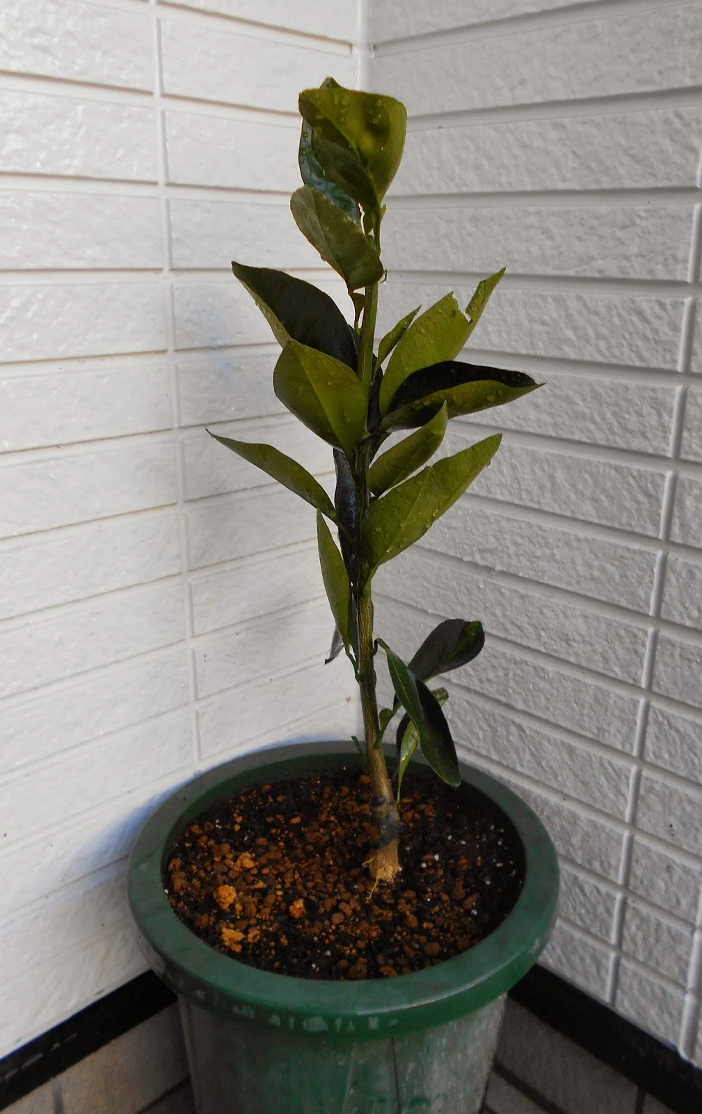 京都の業者で注文してあったオレンジの苗が、昨日の夕方まだ明るいうちに届いたので、園芸店が閉まらないうちに急いで土を買ってきて植えつけました。ネーブルオレンジのひとつ「カラカラ」で、「ピンクネーブル」とも呼ばれています。