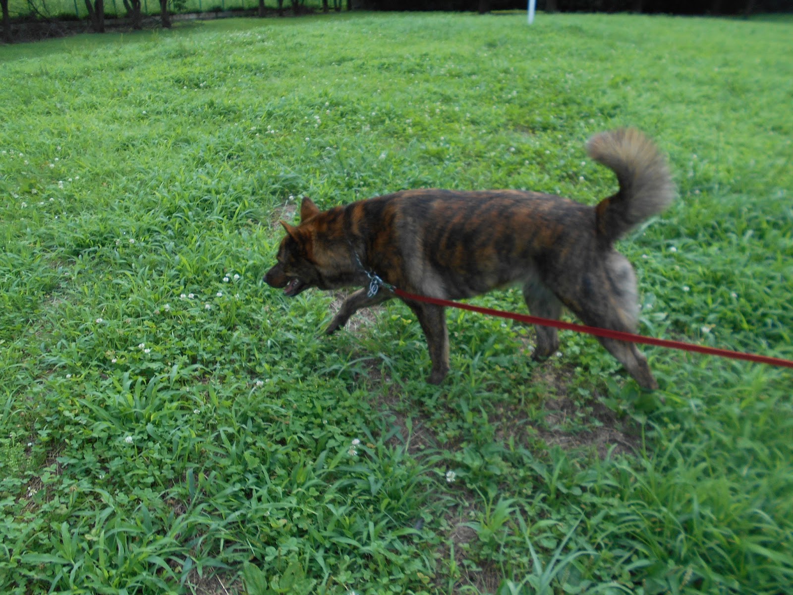 初めてみるシェパードの飼い主さんとおしゃべり。シェパードはもう13歳なので、後ろ足の関節が大変そう。一緒に飼われている小型犬たちのずっと後ろを必死について歩いていました。