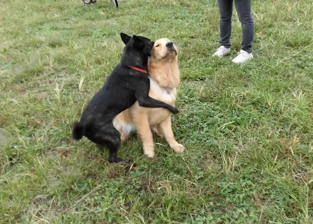 タイガが白黒ボーダーのモノ君の飼い主さんに甘えています。