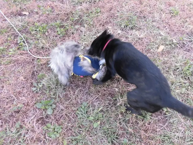 ラブラドゥードルのアルバスとケアンテリアのチャンプが元気一杯でじゃれ始めました。