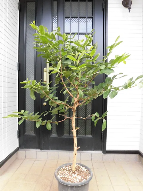 今年の春に地植えにした黄肉グアバ2本のうち、実のついている方だけ未だ鉢上げしてありませんでした。生憎、実がついたのは日当たりの悪いほうの苗で、秋になって日が短くなると、早朝の2,3時間しか直射日光が当たらなくなりました。なので、実の成長も完全にストップ。