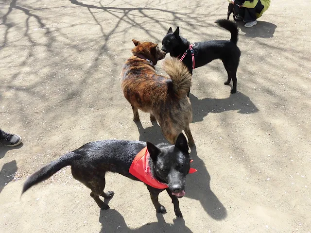 ドッグランの桜も終わり近いですが、せっかくなので和犬と桜の組み合わせ。タイガとヒナちゃんです。こうやってみるとタイガはダイエットの必要がありますね。