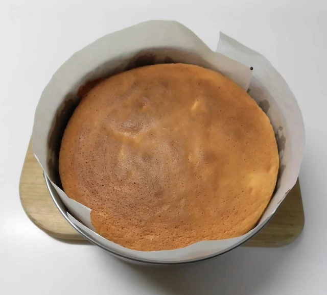 まずはスポンジケーキを焼きます。材料は直径18cm型用のものですが、実際に使った型は21cmです。なぜなら、スポンジの上にチーズケーキを乗せるために、スペース余裕が欲しいからです。