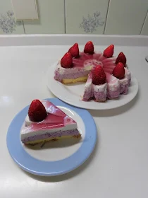 プレーンができると固まらないうちに一部を容器に流し込み、残りのプレーンに撹拌機に掛けたベリーの溶液を混ぜます。それを型に流し込んだところでやっと余裕ができてこの↓写真が撮れました。