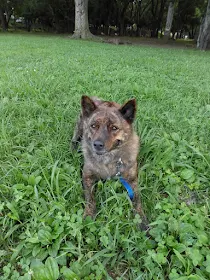 公園に到着。犬友の間で「窪地」とよんでいる草地で用足しのあと一休み。ダイエット効果で、写真の角度によっては少しだけクビレが見えてきました。