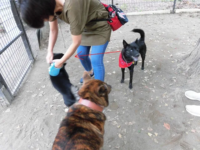 New arrivals - Ron, Pit Bull, and his 'sister' Genie, greeted by Takeo.