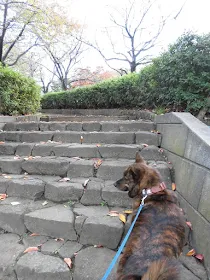 モミジ林のあとは城北公園へ向かうことにしました。本来なら山を歩き回る犬種の犬と一緒なので、遊歩道は無視で斜面を斜めに移動。