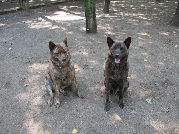 甲斐犬2頭を並べてポーズをとらせました。タイガはいつものオヤジ座りです。