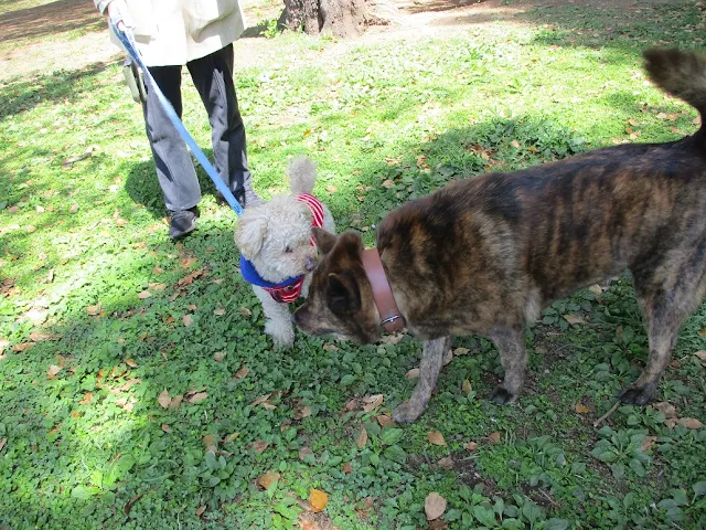 A new face: 4-year old, male toy poodle approaches Taiga eagerly, which made the hair stand up on her back. According to his mom, he normally doesn't like other dogs and he lacks doggie-world manners.