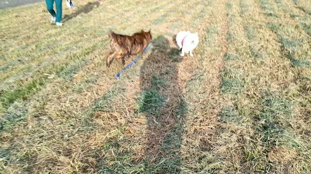 でも、横の草地では伸び伸びと草風呂を楽しんでいました。最後に会ったのは未だ春だった記憶で、その頃は具合が良くなかったのですが、今日は別ワンコのようです。医者に見せたところ甲状腺に関わる問題があったそうで、今は薬ですっかり元気。以前は毛の生え具合も不調で、ところどころ地肌が見えるくらいでしたが、今日のおもちちゃんのコートはびっしり。なにより目つきがイキイキしています。