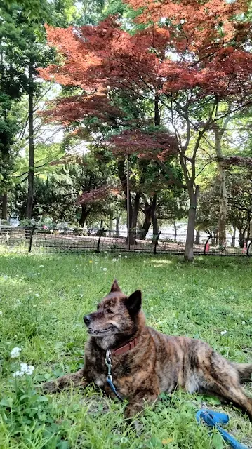今朝はいつもより遅めに 家を出て城北中央公園手前の草地に着いたら、近所の紀州犬のウメちゃんと会えました。最後に会ったのは真冬だったので数か月ぶりです。ウメちゃんちは我が家とは目と鼻の先の距離ですが、散歩の時間帯が合わないとなかなか会えません。