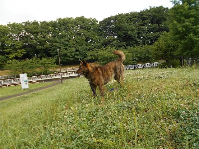 リードを放されて有利なタイガは、ジャズ君の臭いも嗅ぎ放題。