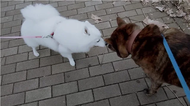 When we went out after lunch for Taiga's 3rd walk of the day, a cat crossed the road ahead of Taiga. It went into a bicycle park of a condominium and started looking at Taiga from behind the wire fence.